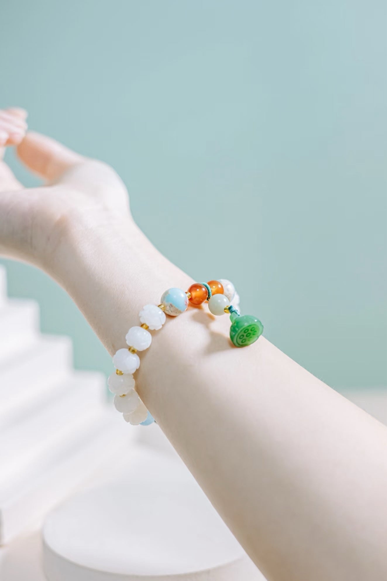 Rooted in the tranquil spirit of Faxi Temple, this bracelet draws inspiration from white lotus blossoms — pure, resilient, and awakening. Made with carved white Bodhi seed beads and gold-veined jade, it reflects the journey toward clarity and inner light.